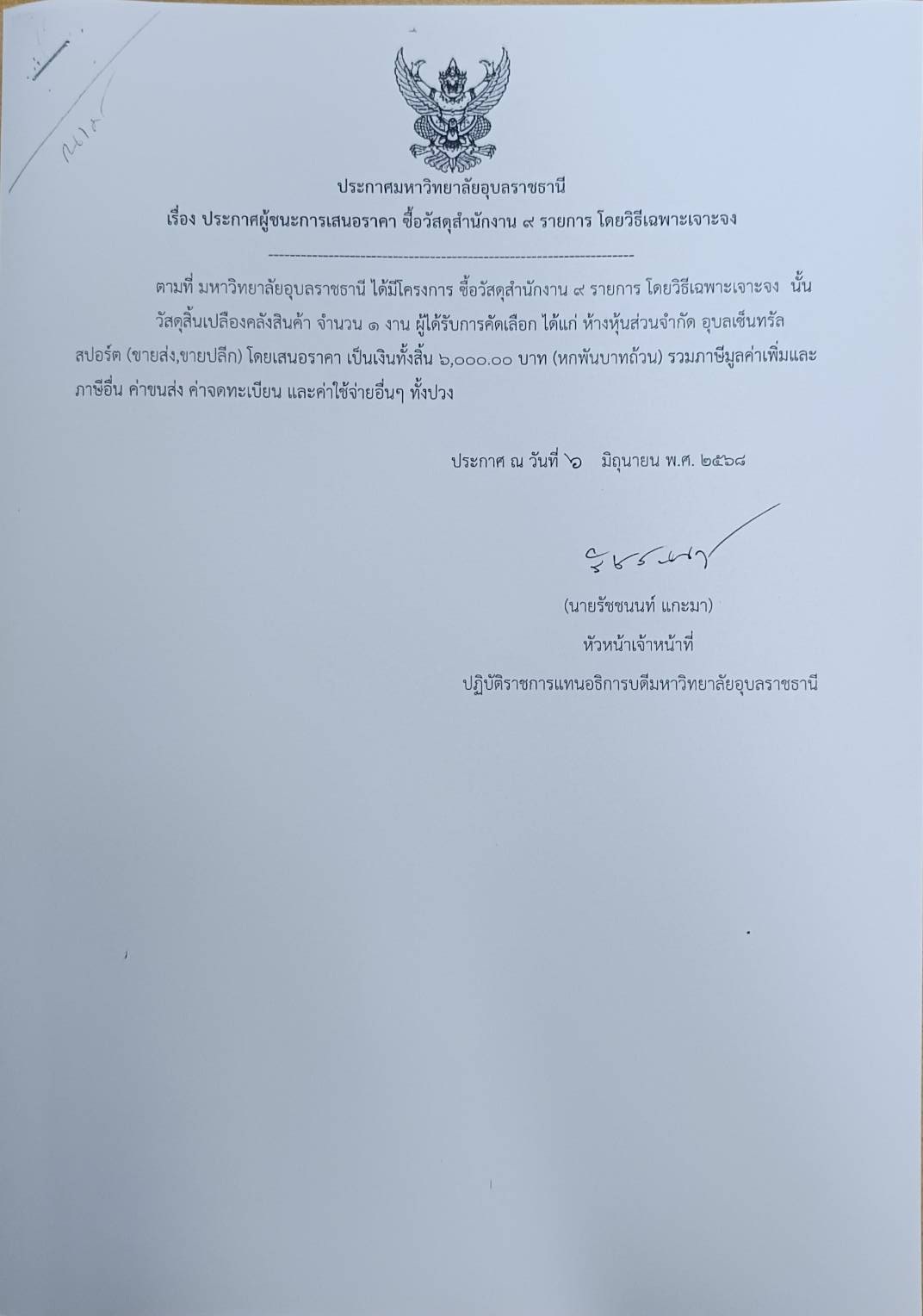 ประเภทข่าว : / ประกาศผลการจัดซื้อจัดจ้าง / งบดำเนินงาน ประกาศข่าวโดย : นายพงศ์ปณต ทองแท่น / สำนักงานอธิการบดี ประกาศวันที่ : 10-06-2568 งบประมาณ : 6,000.00