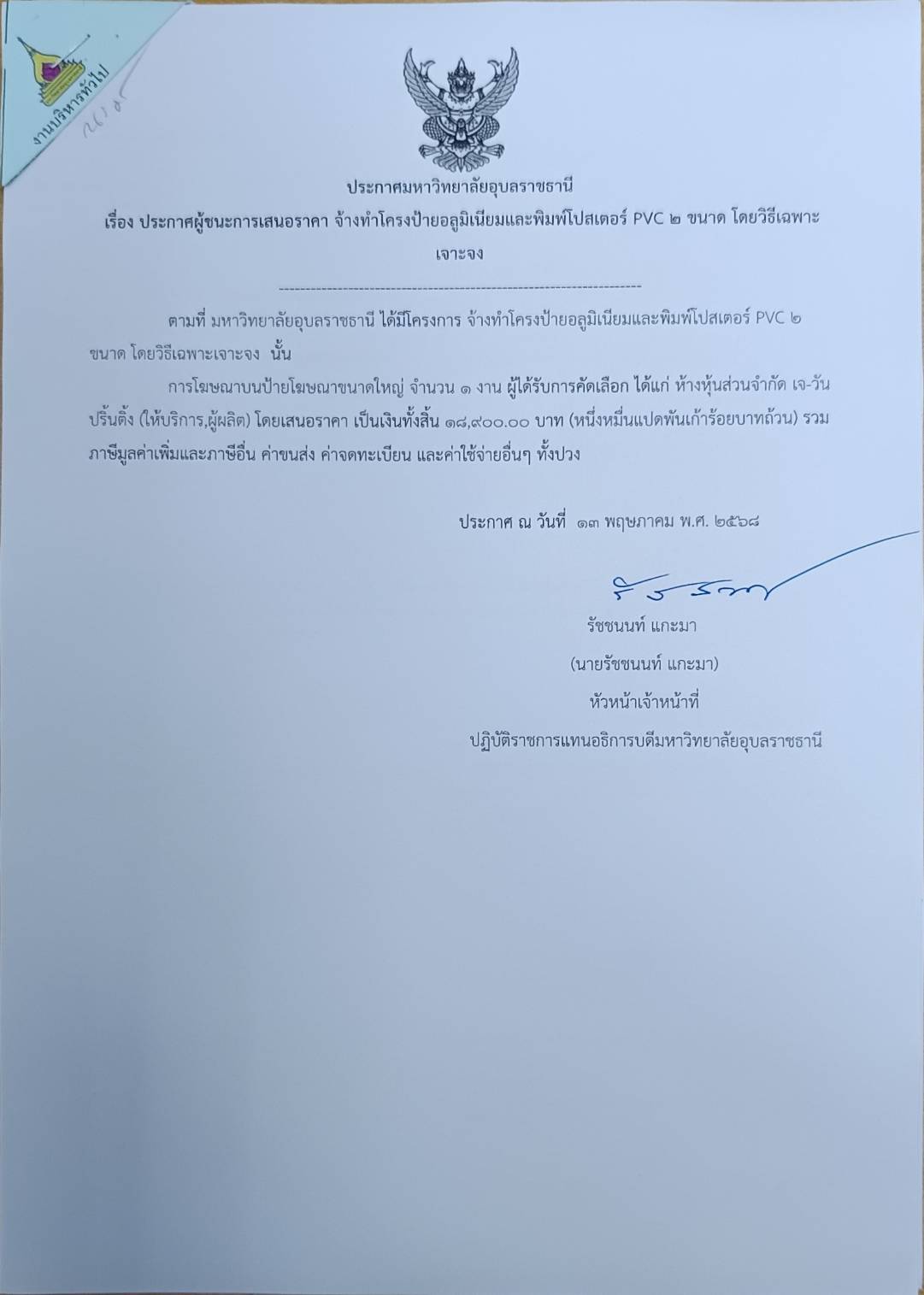ประเภทข่าว : / ประกาศผลการจัดซื้อจัดจ้าง / งบดำเนินงาน ประกาศข่าวโดย : นายพงศ์ปณต ทองแท่น / สำนักงานอธิการบดี ประกาศวันที่ : 11-06-2568 งบประมาณ : 18,900.00