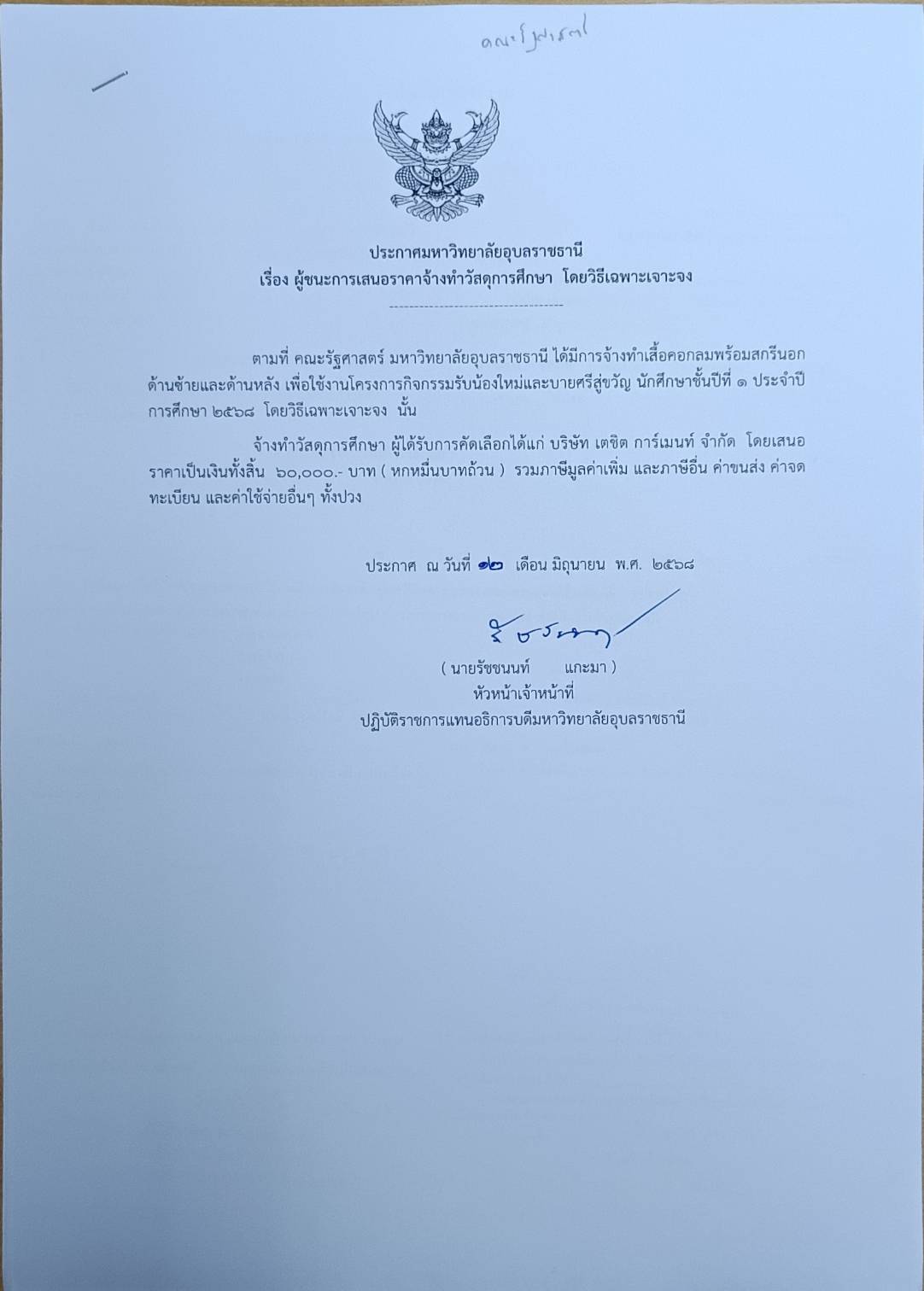 ประเภทข่าว : / ประกาศผลการจัดซื้อจัดจ้าง / งบดำเนินงาน ประกาศข่าวโดย : นายพงศ์ปณต ทองแท่น / สำนักงานอธิการบดี ประกาศวันที่ : 12-06-2568 งบประมาณ : 60,000.00