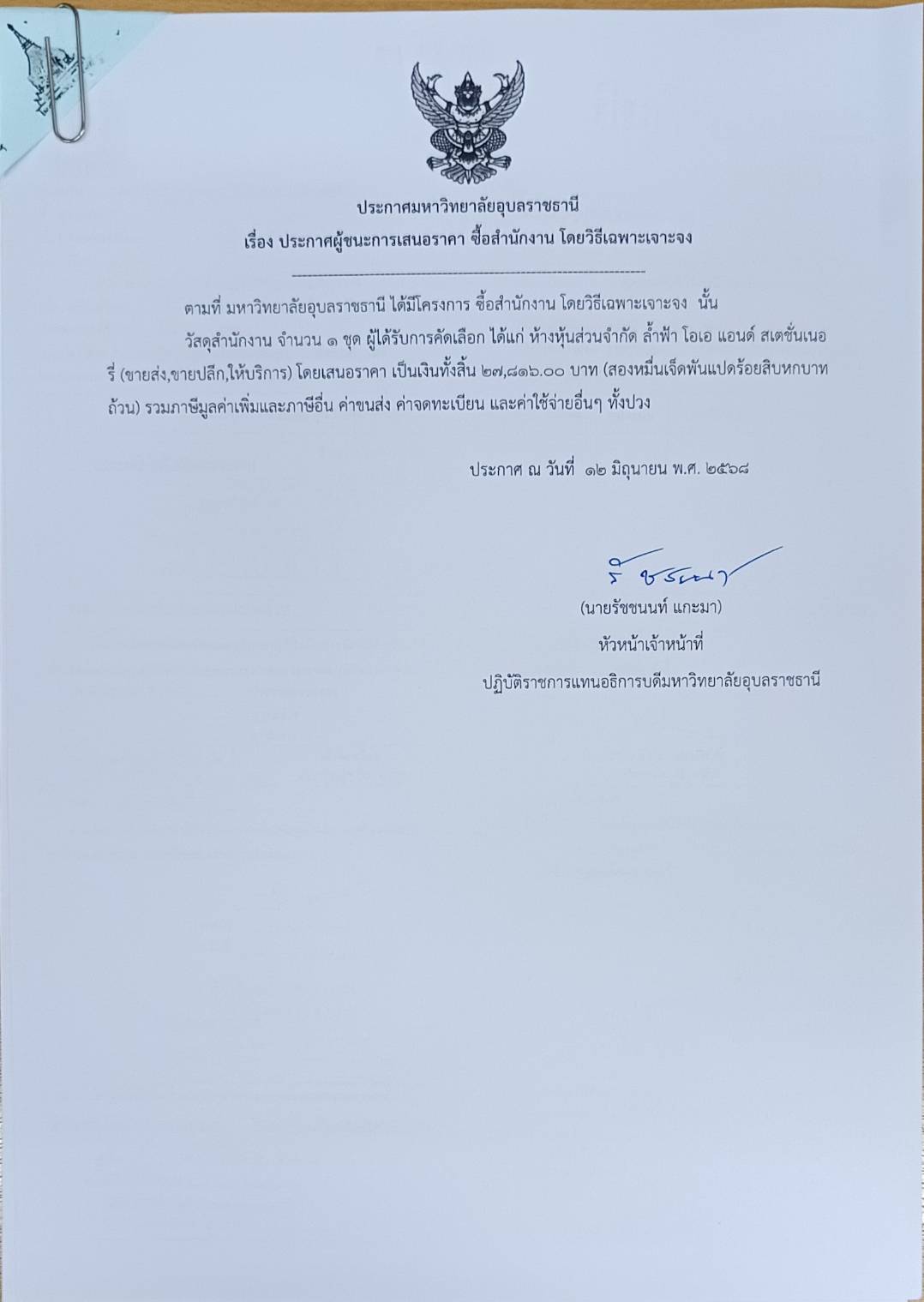 ประเภทข่าว : / ประกาศผลการจัดซื้อจัดจ้าง / งบดำเนินงาน ประกาศข่าวโดย : นายพงศ์ปณต ทองแท่น / สำนักงานอธิการบดี ประกาศวันที่ : 12-06-2568 งบประมาณ : 27,816.00