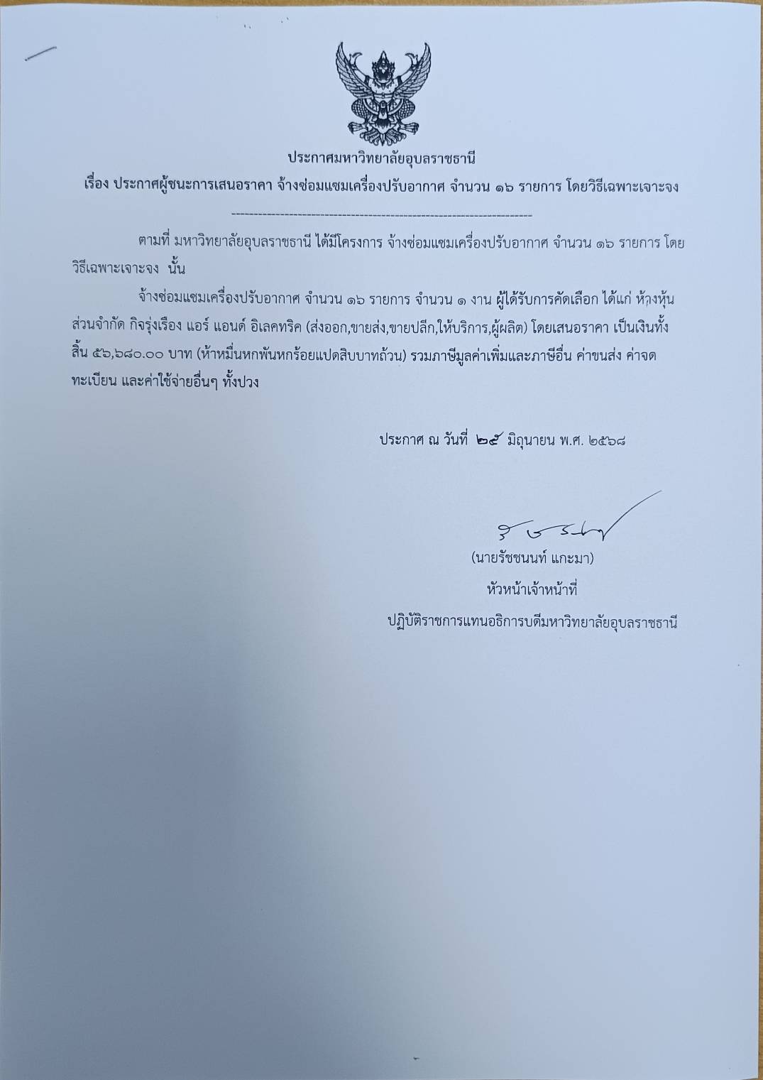 ประเภทข่าว : / ประกาศผลการจัดซื้อจัดจ้าง / งบดำเนินงาน ประกาศข่าวโดย : นายพงศ์ปณต ทองแท่น / สำนักงานอธิการบดี ประกาศวันที่ : 25-06-2568 งบประมาณ : 56,680.00