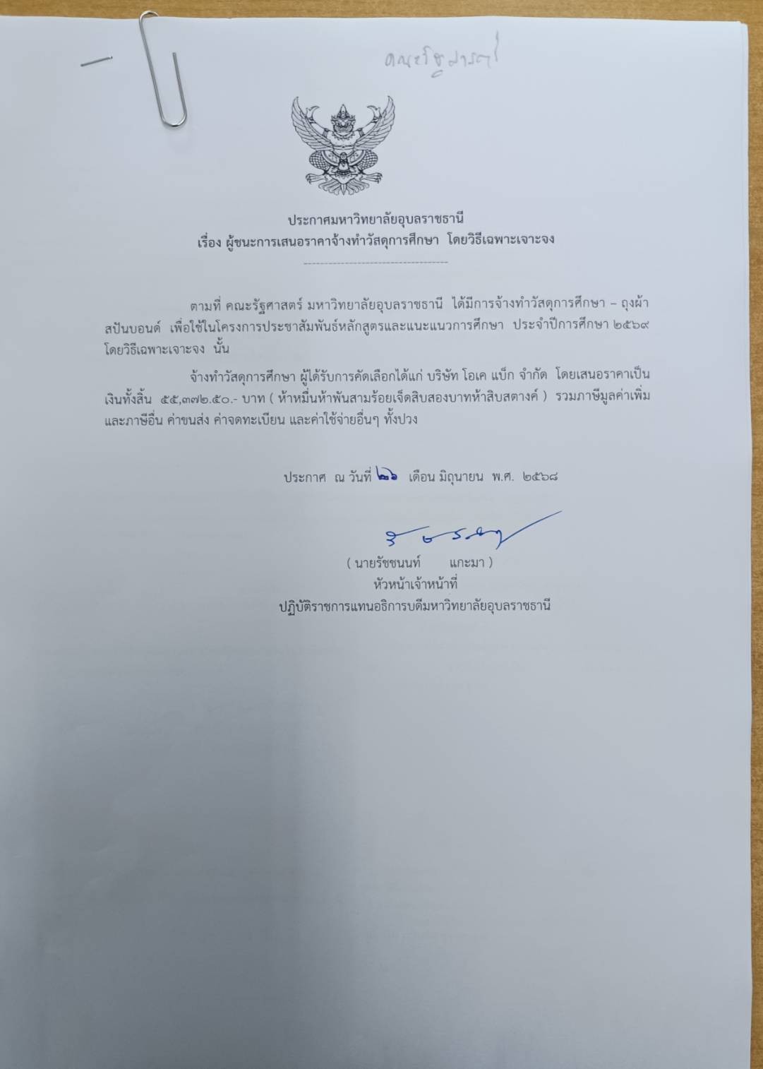 ประเภทข่าว : / ประกาศผลการจัดซื้อจัดจ้าง / งบดำเนินงาน ประกาศข่าวโดย : นายพงศ์ปณต ทองแท่น / สำนักงานอธิการบดี ประกาศวันที่ : 26-06-2568 งบประมาณ : 55,372.50