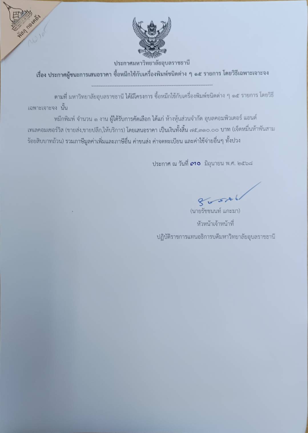 ประเภทข่าว : / ประกาศผลการจัดซื้อจัดจ้าง / งบดำเนินงาน ประกาศข่าวโดย : นายพงศ์ปณต ทองแท่น / สำนักงานอธิการบดี ประกาศวันที่ : 30-06-2568 งบประมาณ : 75,310.00