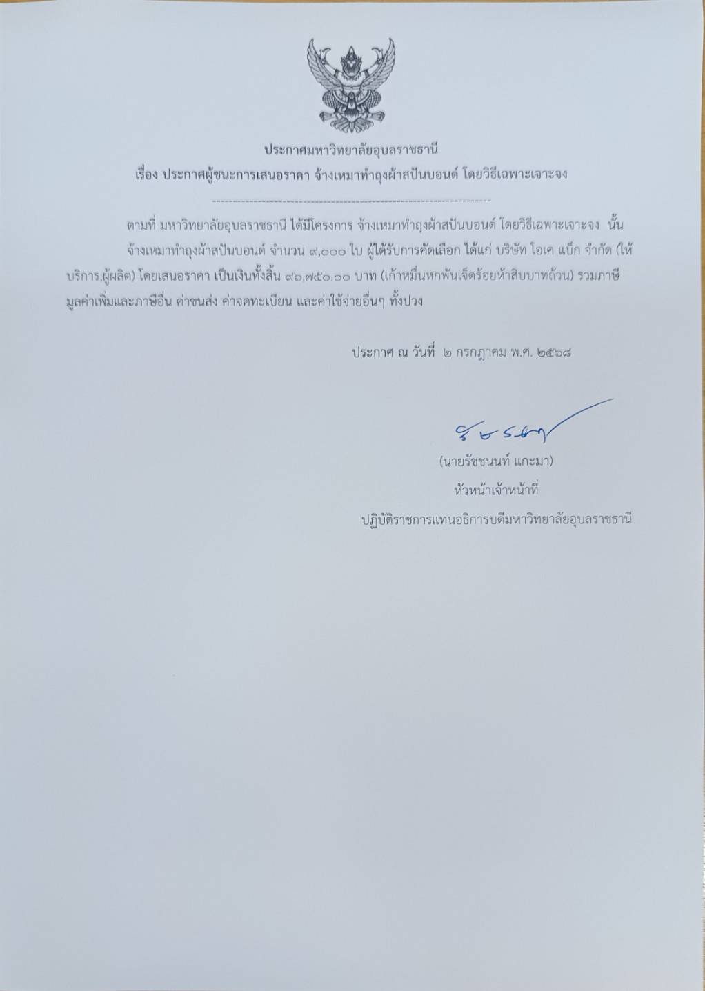 ประเภทข่าว : / ประกาศผลการจัดซื้อจัดจ้าง / งบดำเนินงาน ประกาศข่าวโดย : นายพงศ์ปณต ทองแท่น / สำนักงานอธิการบดี ประกาศวันที่ : 02-07-2568 งบประมาณ : 96,750.00