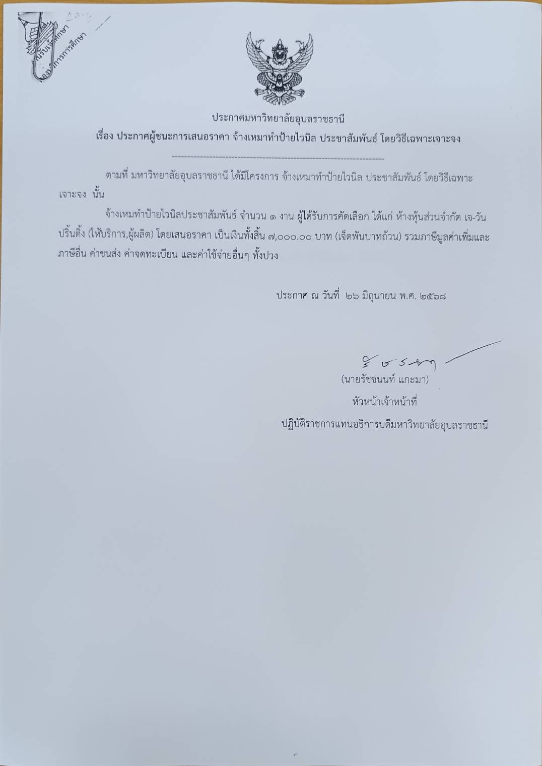 ประเภทข่าว : / ประกาศผลการจัดซื้อจัดจ้าง / งบดำเนินงาน ประกาศข่าวโดย : นายพงศ์ปณต ทองแท่น / สำนักงานอธิการบดี ประกาศวันที่ : 04-07-2568 งบประมาณ : 7,000.00